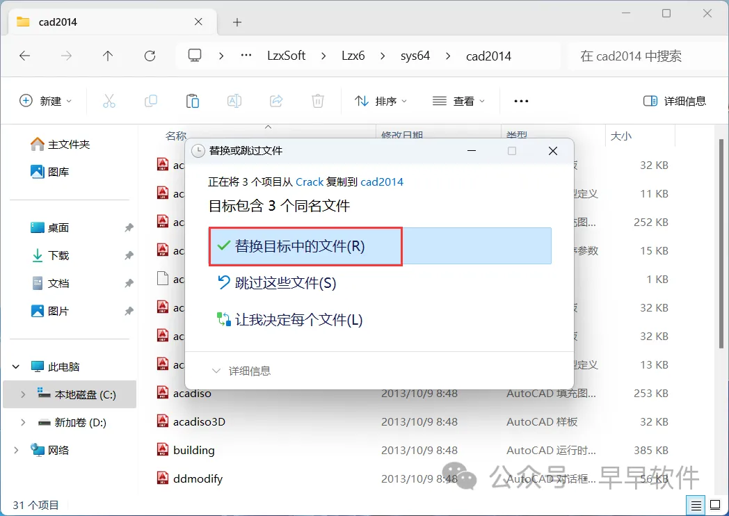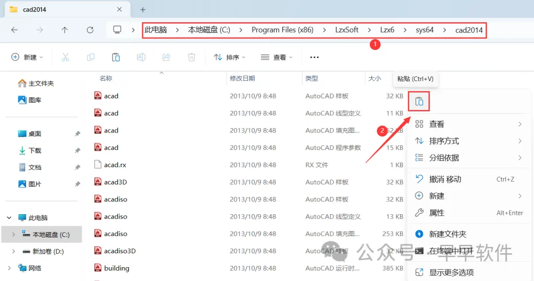 14、打开路径:C:\Program Files (x86)\LzxSoft\Lzx6\sys64\cad2014,右键文件夹的空白处,点击【粘贴按钮】