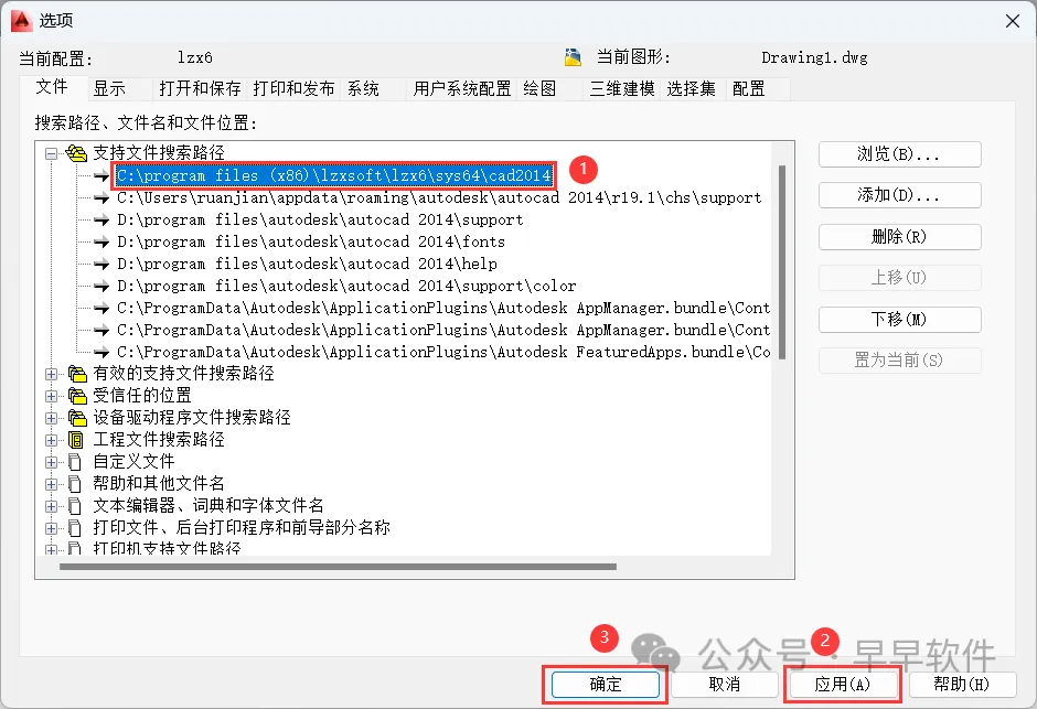 20、路径输入:C:\Program Files (x86)\LzxSoft\Lzx6\sys64\cad2014(第7步查看软件安装路径),点击【应用】,再点击【确定】