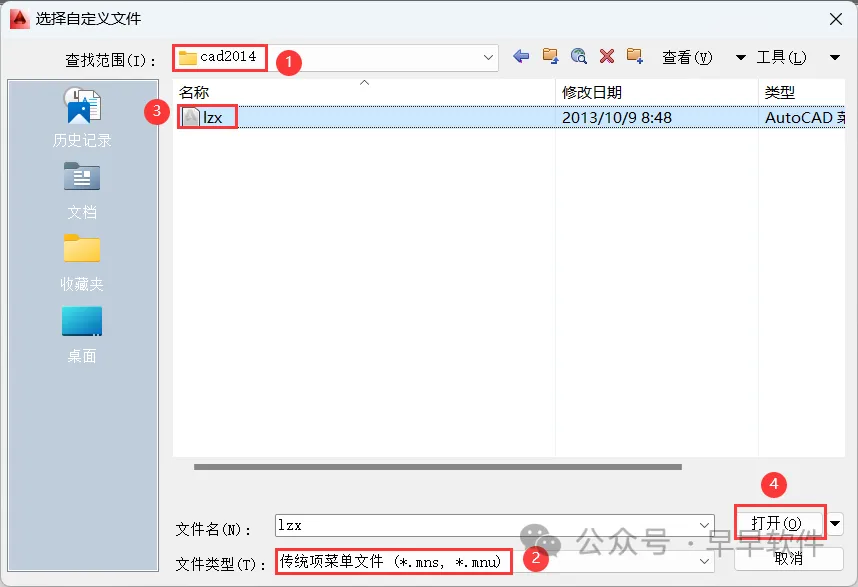 23、找到安装路径:C:\Program Files (x86)\LzxSoft\Lzx6\sys64\cad2014(第7步查看软件安装路径),文件类型选择:传统项菜单文件(*.mns,*mnu),选中【lzx】文件,再点击【打开】
