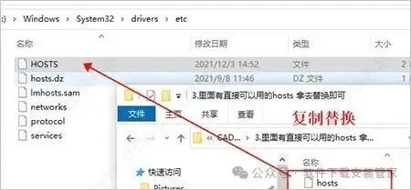 5、然后将hosts文件复制到【C:\Windows\System32\drivers\etc】替换原文件