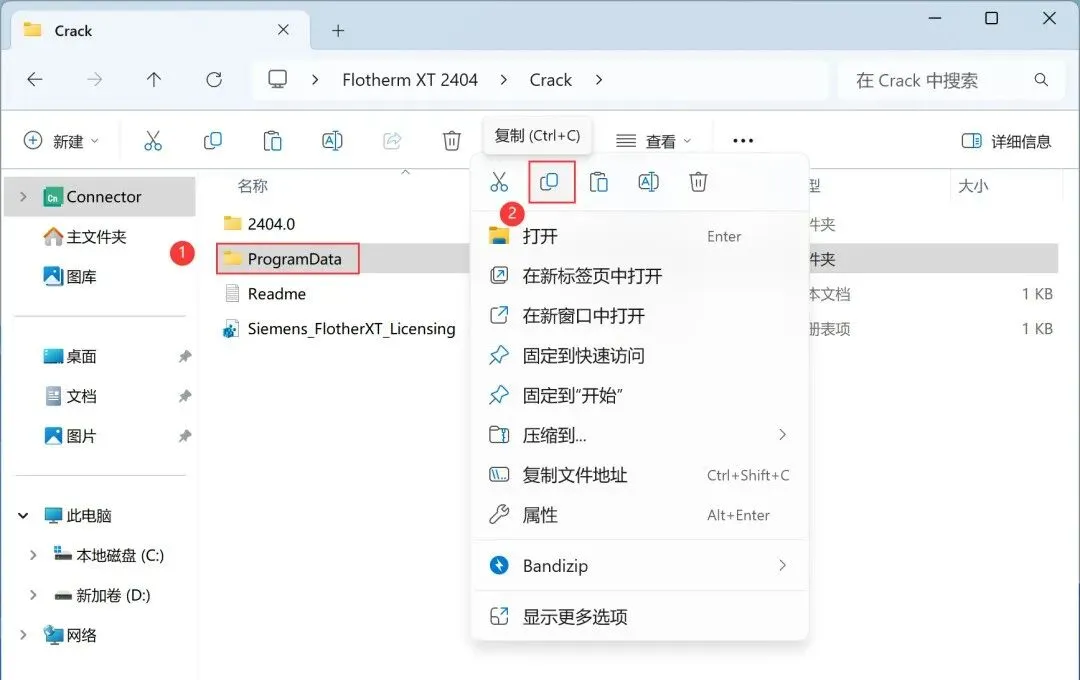 21、回到Crack文件夹,找到并选中【ProgramData】文件夹,再右键点击【复制按钮】