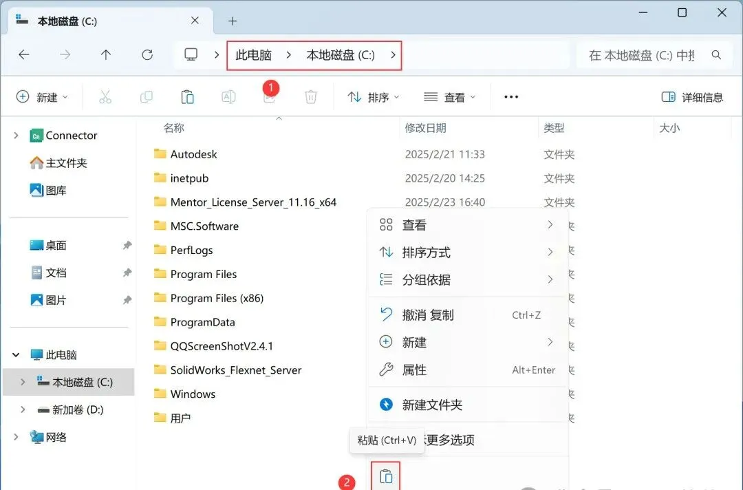22、打开本地C盘,右键文件夹的空白处,点击【粘贴按钮】