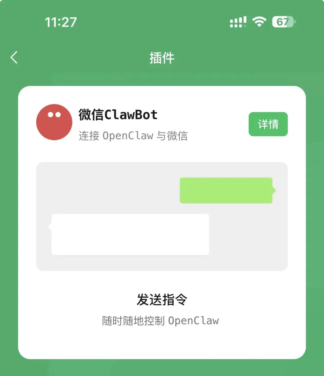 首先将移动端微信升级到当前最新版版本 8.0.70。如果没看到「微信 ClawBot」这个插件,后台退出重新打开微信。点击插件「详情」,按照提示在安装 openclaw 的机器上执行命令:npx -y @tencent-weixin/openclaw-weixin-cli@latest install