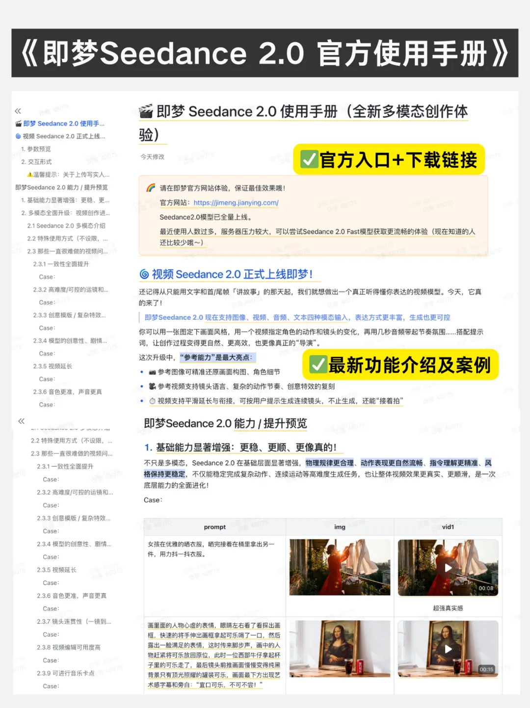 内含《即梦Seedance 2.0 官方使用手册》和《即梦AI 官方功能介绍和场景案例》,跟着官方学习,少走弯路!