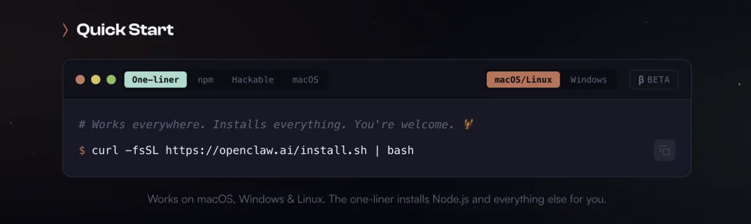 12345678# 安装 OpenClaw CLIbrew install openclaw-cli# 验证安装openclaw --version# 输出示例:# openclaw-cli version: 2026.3.12如果不想通过homebrew安装,也可直接查看其官网教程,按照其操作命令进行安装。官网地址:https://openclaw.ai/