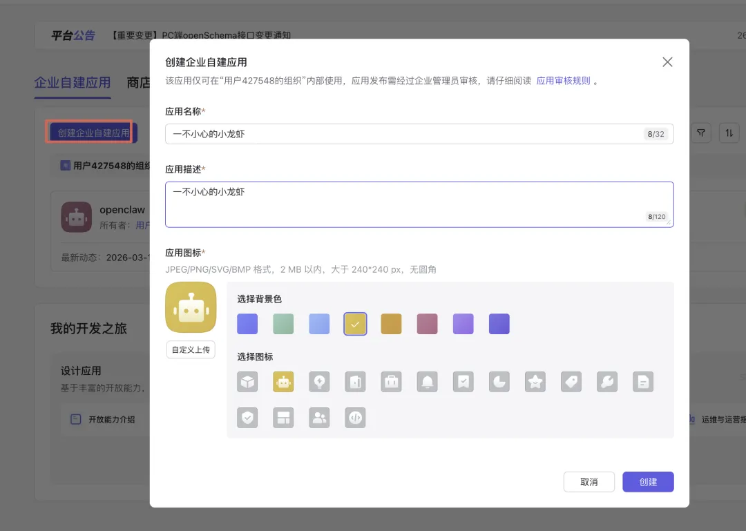 应用名称:填写你的应用名称(如"OpenClaw Assistant") 应用 logo:可选上传 应用介绍:填写应用描述