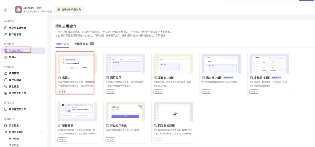 选择左侧菜单:添加应用能力 选择按能力添加下的机器人