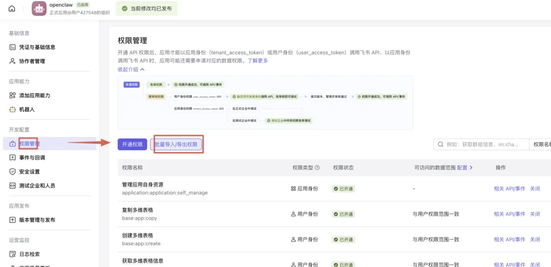 im:message:send- 发送消息 chat:messages:read- 读取消息 点击"权限配置" 添加必要权限: