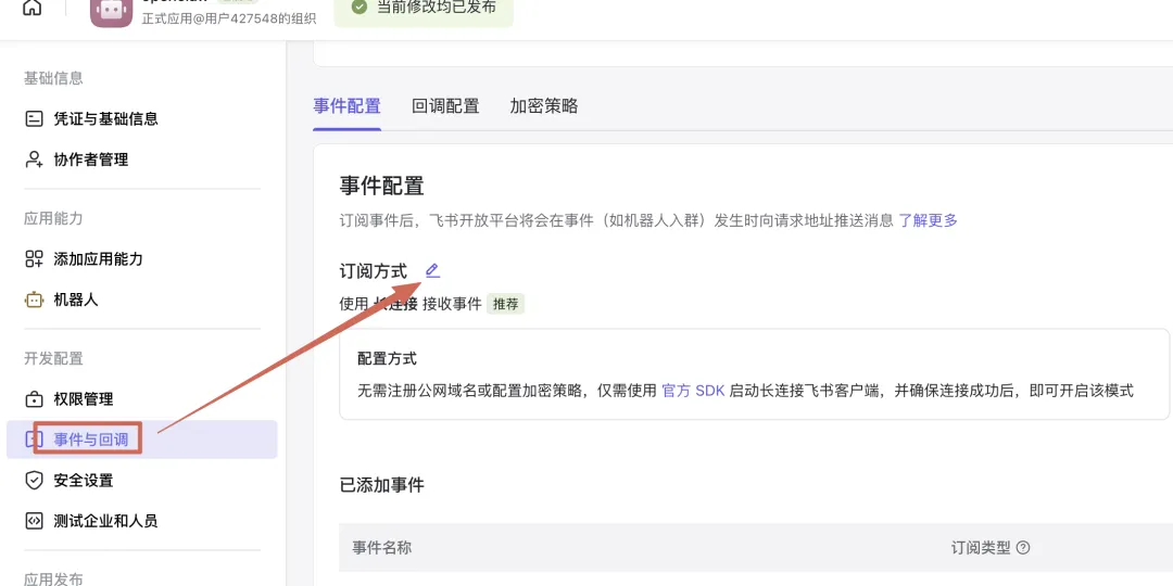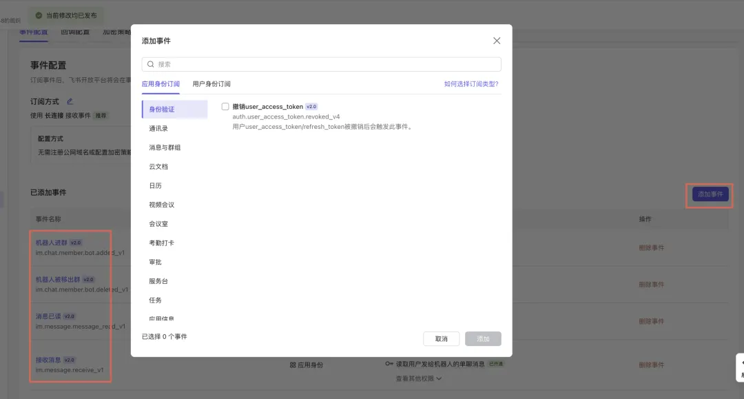 机器人进群:im.chat.member.bot.added_v1 机器人被移出群:im.chat.member.bot.deleted_v1 消息已读:im.message.message_read_v1 接收消息:im.message.receive_v1 订阅方式选择:选择 长连接 添加事件: