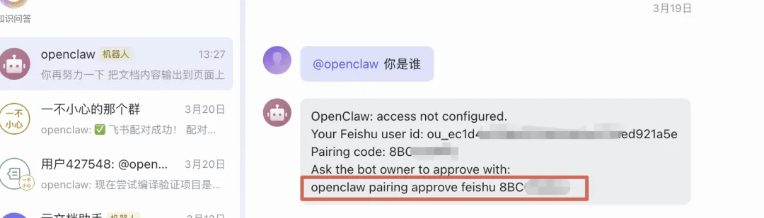 在飞书消息是选择添加的机器人进行对话 得到回复后在终端输入其返回的命令进行配对(如下图)