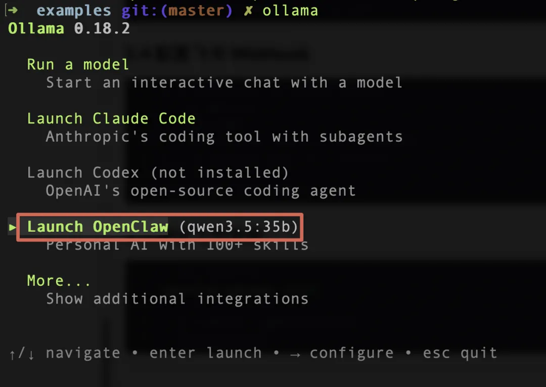 1234# ollama 安装完成后直接输入ollama命令ollama# 出现以下界面 选择 Launch OpenClaw# 再选择你本地已安装模型