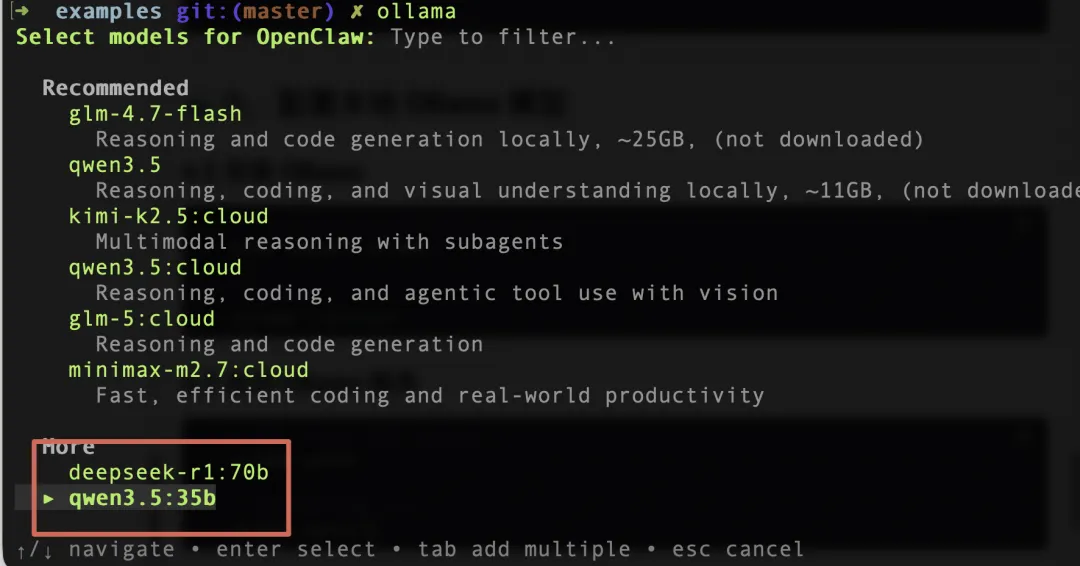 12345678910# 安装 qwen3.5:35b 模型(推荐)ollama pull qwen3.5:35b# 或者安装其他模型:# ollama pull llama3.3# ollama pull mistral# ollama pull gpt-oss# 查看已安装的模型ollama list6.4 配置 OpenClaw 使用 Ollama