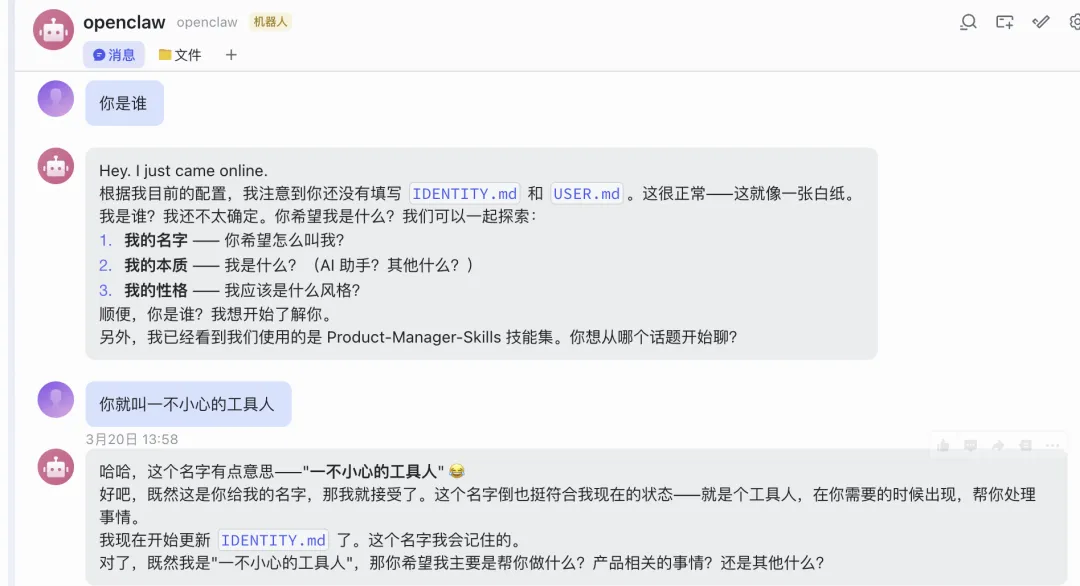 12345# 启动 OpenClawopenclaw gateway start# 在飞书聊天中,搜索你的应用名称# 发送消息测试连接5.6 飞书机器人配置