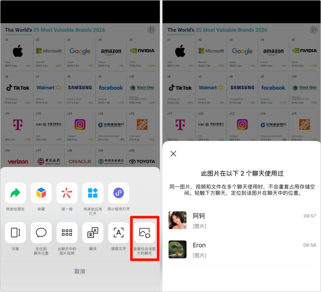 聊天界面长按图片,就能快速调取这张图片的全部发送记录,一键定位到对应的好友或群聊,不用手动翻遍历史对话找记录。