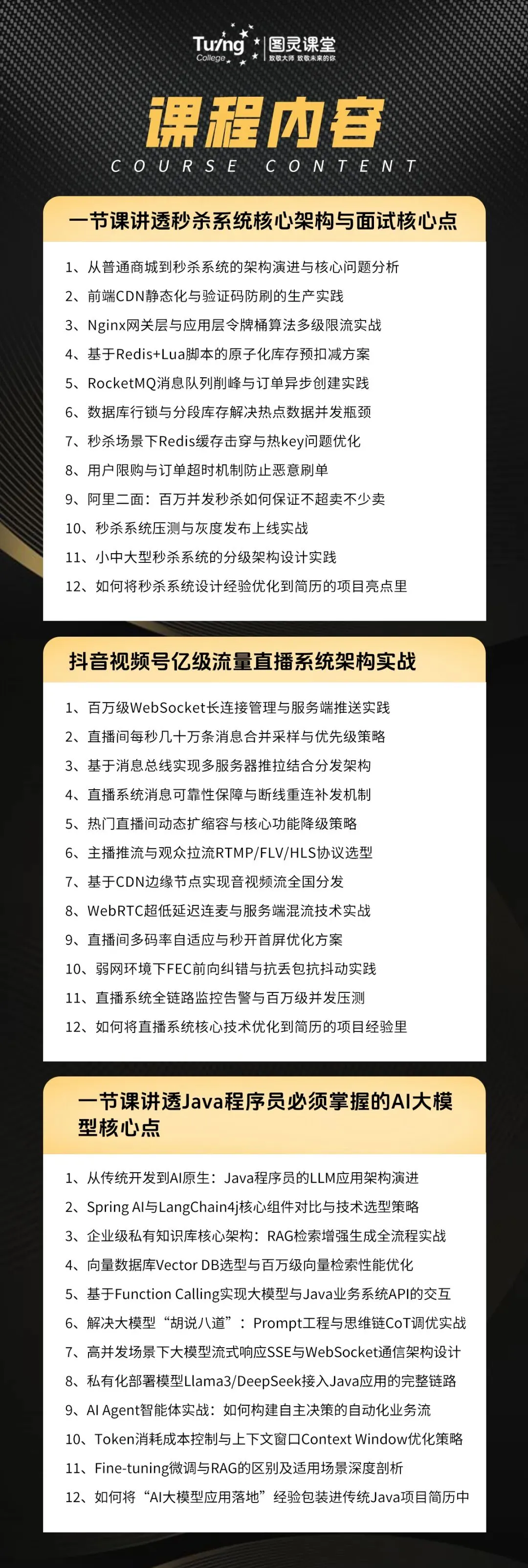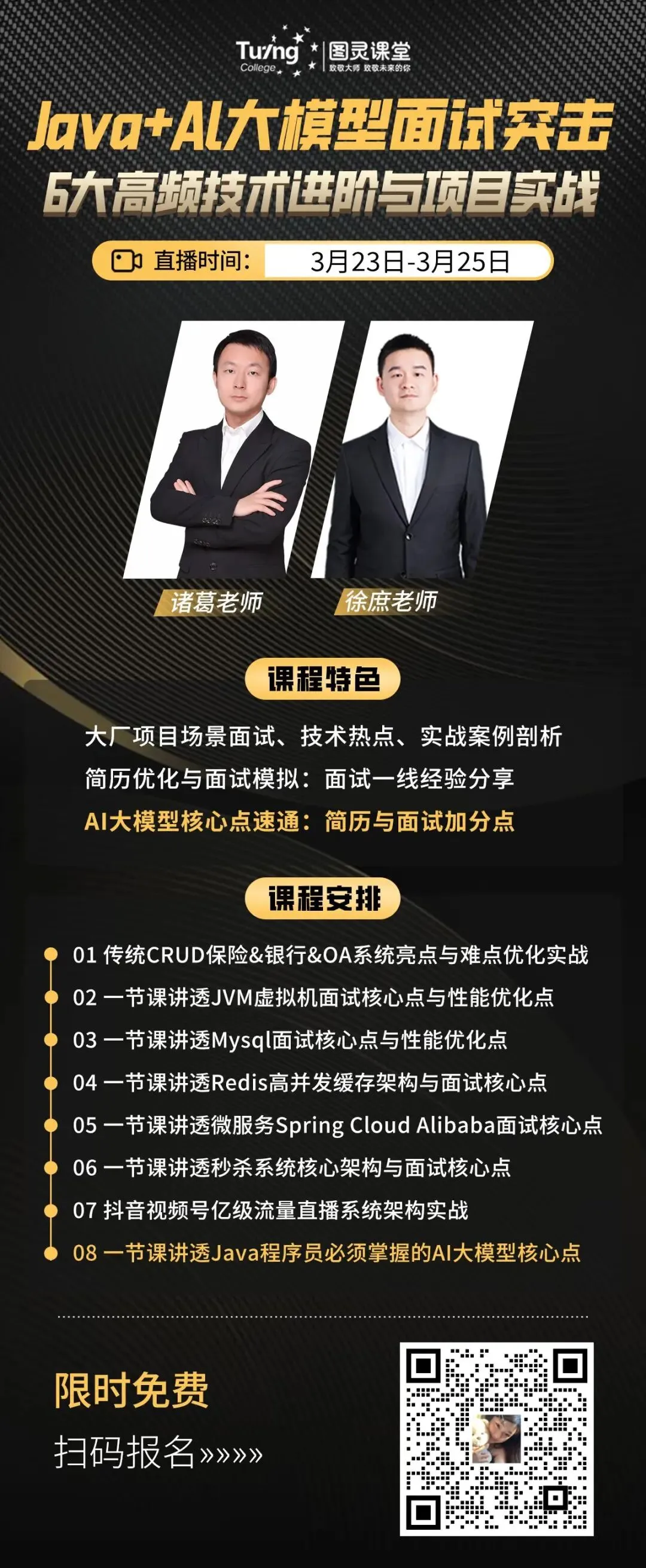 别慌,现在补还来得及!现在正是弯道超车的黄金期,图灵课堂《Java面试+AI大模型面试突击课》重磅开讲,帮你抓住AI时代的涨薪救命稻草。