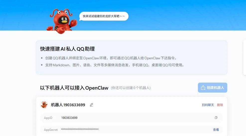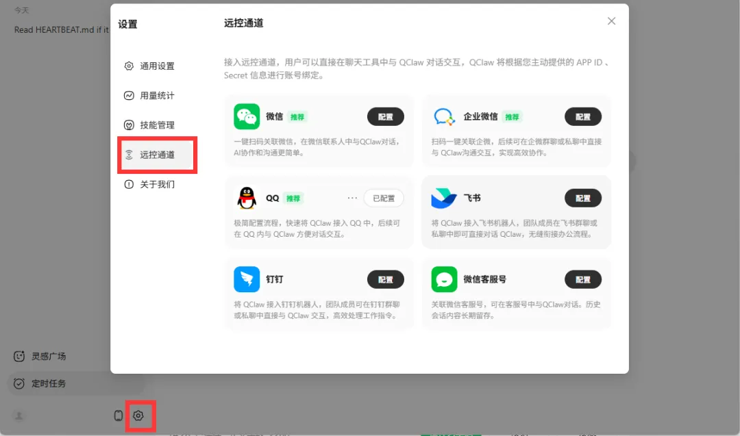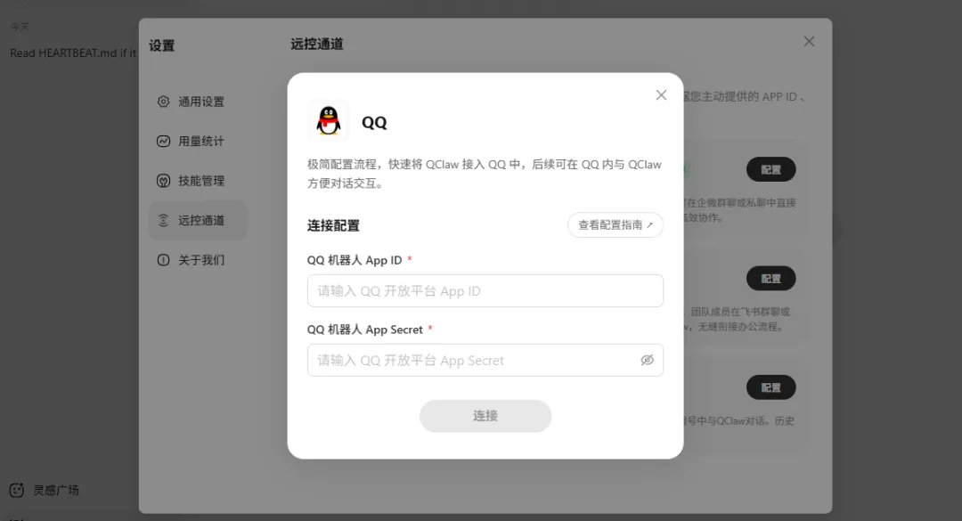 💡提示:接入远控通道,用户可以直接在聊天工具中与 QClaw 对话交互,QClaw 将根据您主动提供的 APP ID 、Secret 信息进行账号绑定