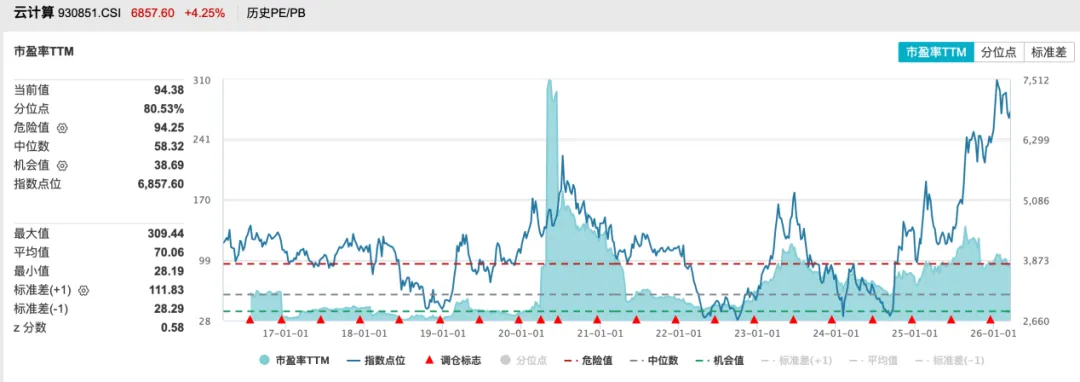 当前,从市盈率角度来看,云计算板块的估值水平已达94.38倍,处于历史80.53%的估值分位,并不算便宜。此时追高的话,必须警惕相应的风险。