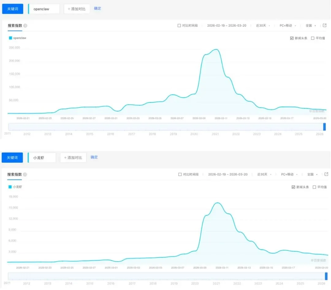 值得注意的是,最近一周,“小龙虾”的热度已经出现大幅回落。微信指数、百度指数里的OpenClaw和“小龙虾”热度,均已明显向正常水平回归。如何卸载“小龙虾”、甩卖Macmini的帖子,也是一天比一天多。