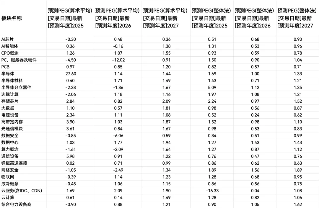 我们将A股中与OpenClaw能沾边的“卖铲子”概念板块的估值情况,进行了简单的整理。其中,PEG指标(市盈增长比率)等于PE/(企业年盈利增长率×100),投资界通常认为PEG小于1表明股价可能被低估。我们可以看到,有些板块的估值已经相当高,而有些板块仍处于高性价比阶段。