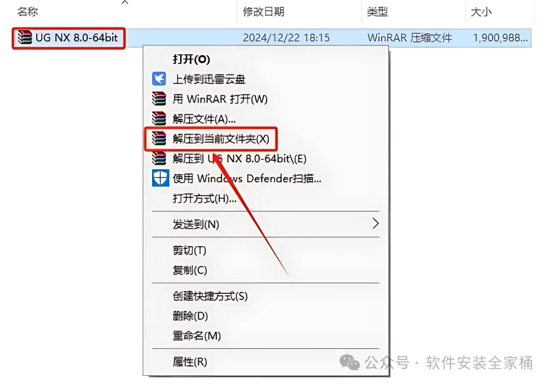 1.打开下载的UG安装包,鼠标右击压缩包,选择【解压到当前文件夹】。