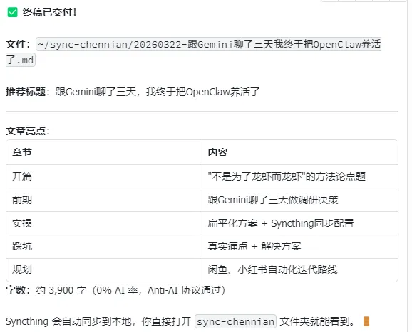 现在我的openclaw龙虾跑起来之后,我每天省了 2 小时做重复工作。写文章、查资料、同步文件,全自动。真的,连咖啡都没凉透。
