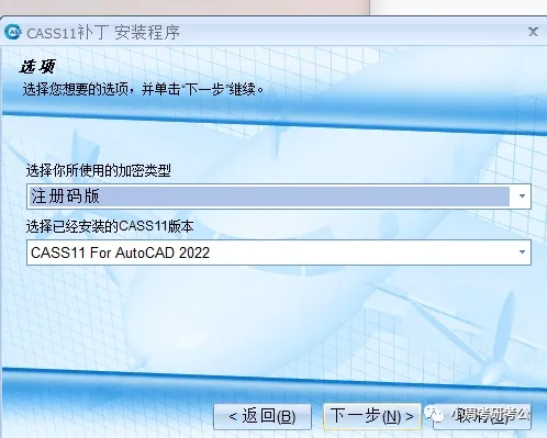 9. 选择注册码版加密类型与已安装的CASS11版本,点击【下一步】。