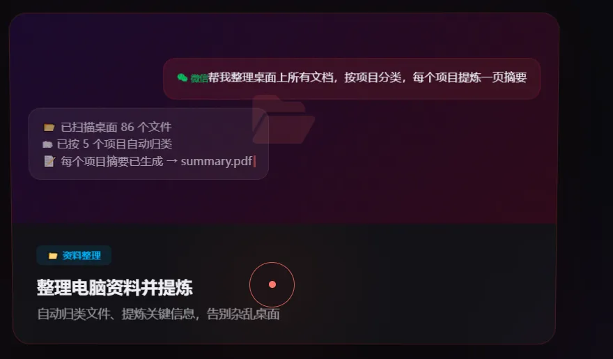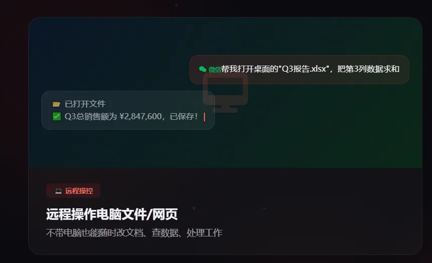 - 微信生态优势:无需打开电脑客户端,微信/QQ直接下达指令,远程操控电脑(如整理文件、发送报表),交互成本极低;