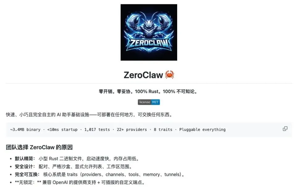 核心技术:采用Rust语言进行轻量重构,保留OpenClaw的核心调度逻辑和工具调用能力,剔除所有冗余模块;优化内存管理机制,将原版的40万+行代码精简至数千行,最终二进制文件仅3.4MB,内存占用不足5MB,相比原版减少99%;支持静态编译,可直接运行在Linux、Windows、macOS等多系统,无需依赖额外运行环境;简化了技能调用机制,仅保留核心的本地工具调用能力,提升响应速度。
