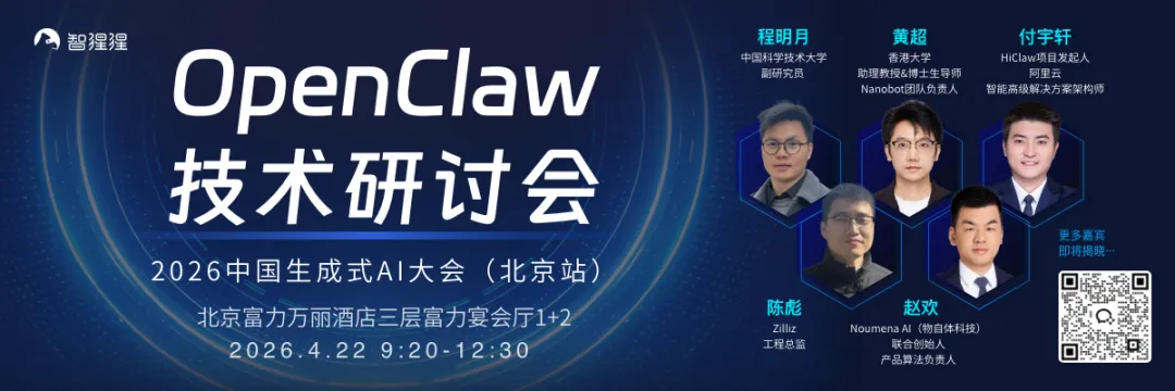 4月21-22日,智猩猩主办的2026中国生成式AI大会将举行,设有开幕式,AI算力基础设施、大模型、AI智能体3大专题论坛,以及OpenClaw、LLM强化学习、大模型记忆等6场技术研讨会。其中,OpenClaw最强轻量平替nanobot团队负责人黄超、Claw-R1项目负责人程明月等学者专家将带来报告分享。