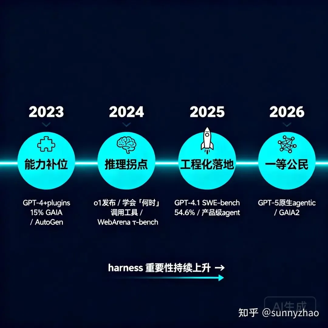最近四年的时间,agent能力从模型的执行扩展的补位者逐步成为核心推理能力的一等公民,这四年的演进路径,粗看是一条模型能力持续提升的曲线,细看却是两条曲线同时在走:一条是模型的 agentic 能力曲线,另一条是工程基础设施的成熟度曲线。