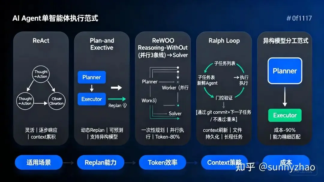 单agent就是整个系统用一个agent来完成所有任务,这个模式实现相对简单,配备对应的工具系统(tools or mcp),单agent在很多场景下已经足够,包括我们现在用到的AI coding agent,例如codex,claude code,默认都是单gent。单agent 的核心运行逻辑就是如何在自己的执行循环里推理和行动,目前有五种主流设计范式,核心差异在于规划与执行是否分离、计划是否可动态修正、context 如何管理、模型选型是否异构: