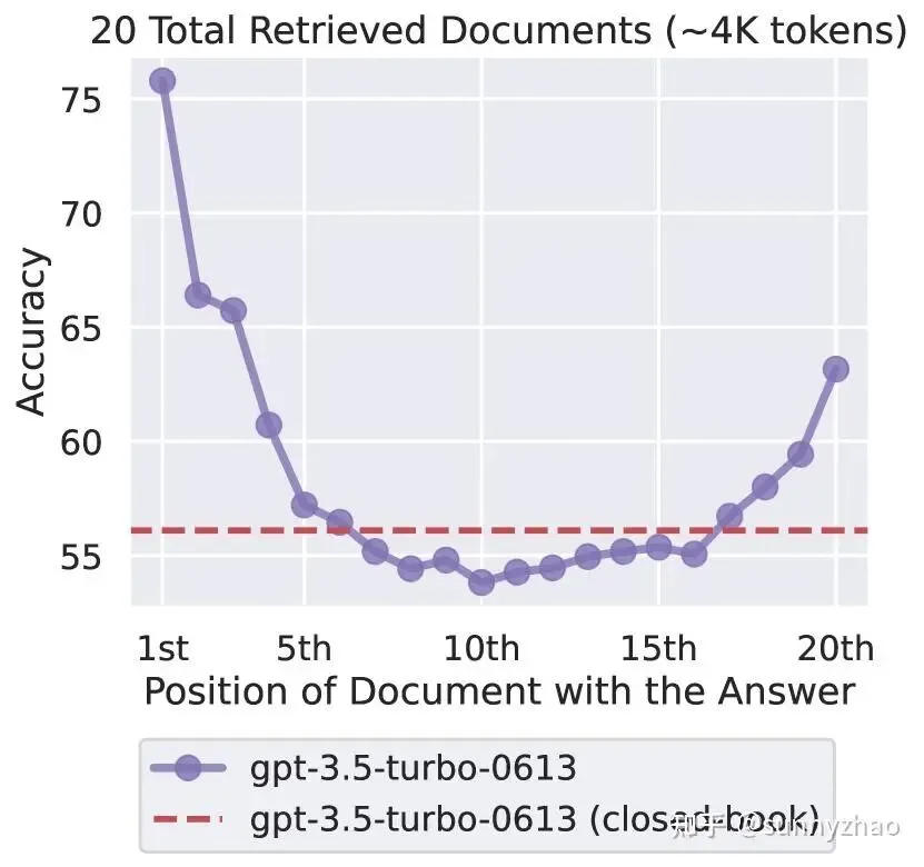 上下文窗口被填满(context pollution)。所有状态都存在同一个 context 里,当任务横跨多个领域、需要同时维持大量工作记忆时,上下文会被稀释。OpenAI Codex 官方文档把context pollution / context rot作为引入多 agent 的核心技术动机之一。Stanford 的「lost-in-the-middle」研究给出了量化依据:关键信息在 4000 token context 开头准确率 75%,放中间跌到 55%。这是单 context 在高信息密度下的结构性退化,不是 prompt 写得不好的问题。
