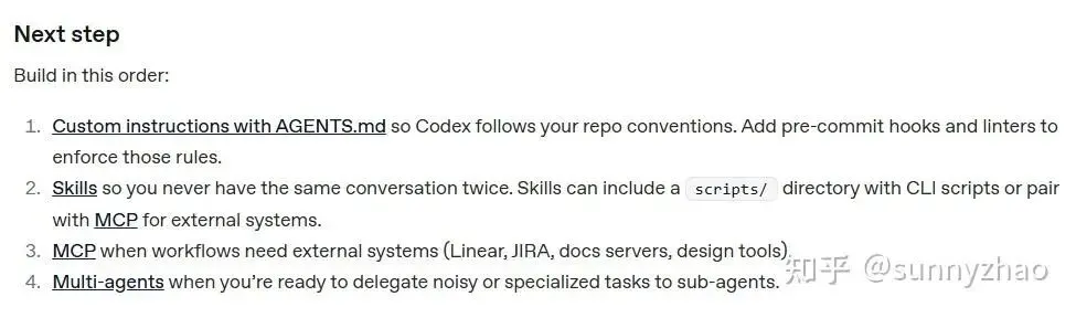 触碰到上述边界之后,不是“要不要用多 agent”的问题,而是“用哪种多 agent 架构模式”的问题。OpenAI Codex 给出了一个明确的能力渐进升级路径:先用 Skills 封装可复用能力,再用 MCP 连接外部系统,最后才是 Multi-agents—“当你准备好把嘈杂或专业化的任务委派给子 agent 时”再引入多 agent。