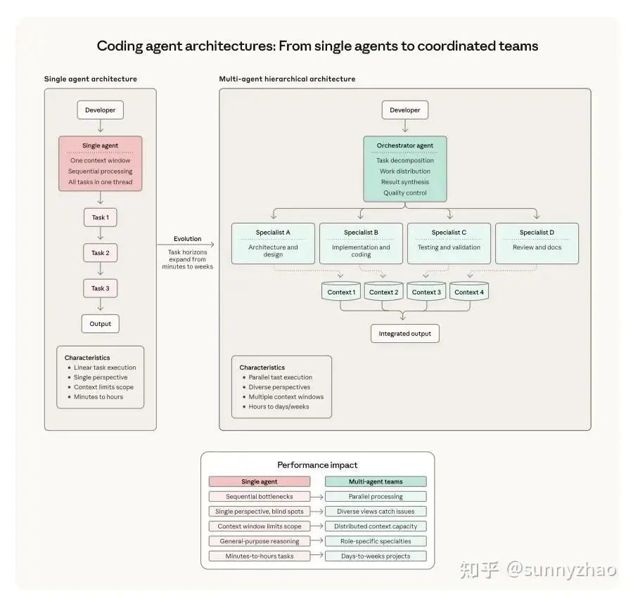 需要真正的并行执行。单 agent 天然串行—当任务结构是「同时从十个数据源收集信息再汇总」时,单 agent 只能排队,时延线性叠加。