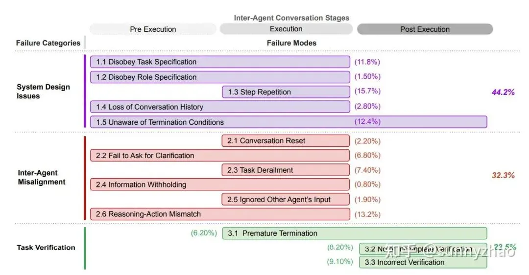 把系统从单 agent 升级到 MAS,不是把单agent能力直接做累加乘法,而是复杂度呈现指数增长趋势。在《Why Do Multi-Agent LLM Systems Fail?》这篇论文中,UC Berkeley 的研究者从 7 个主流 MAS 框架收集了1,642 条执行轨迹,建立了一个系统性的 MAS 失败分类框架(MAST),识别出 14 种细粒度失败模式,归入三大类:
