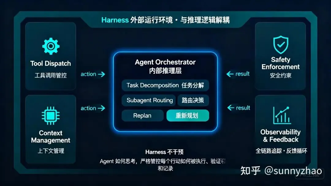 解法不是试图消除不确定性,而是在 agent 的外部构建一套与其推理逻辑解耦的运行环境,agent 的 orchestrator 负责怎么做-任务分解、路由、replan,这套外部环境则负责“如何有效执行”,包括工具调用的权限约束、context 的策略管理、全链路可观测、安全门控等。治理、控制、安全不是和agent编排并列的模块,而是包裹在编排之外、让编排结果可信的基础设施。这就也就是最近我们经常看到的一个概念 - Harness Engineering。