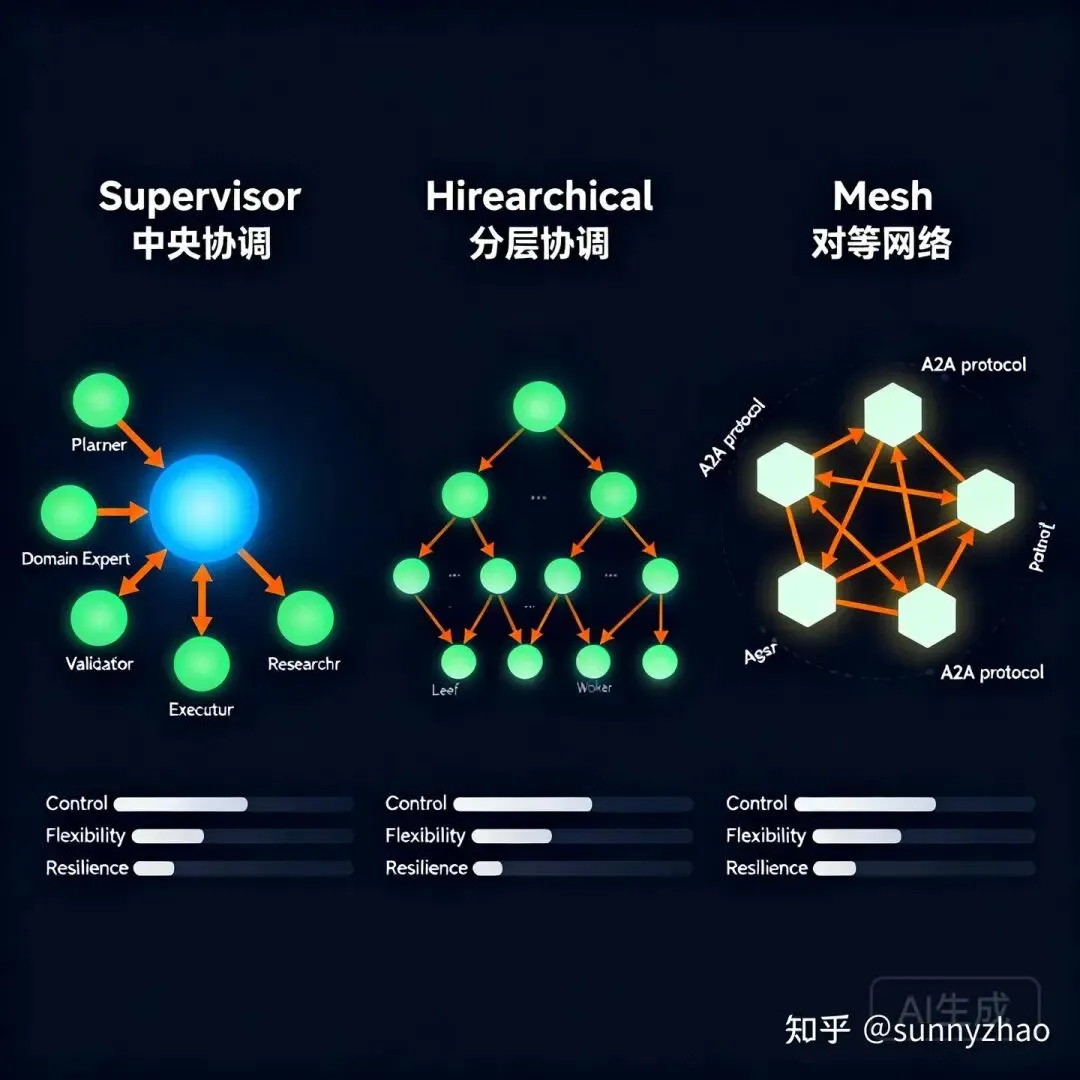 协调拓扑的动态选择:根据任务特性选择 Supervisor / Hierarchical / Mesh 拓扑,而不是固定一种。时效性要求高的并行任务偏向 Mesh;合规性要求高的任务偏向 Supervisor 串行审批;复杂长链路任务偏向 Hierarchical 分层分发。这需要 Orchestrator 在运行时具备任务特征识别和拓扑动态配置能力。