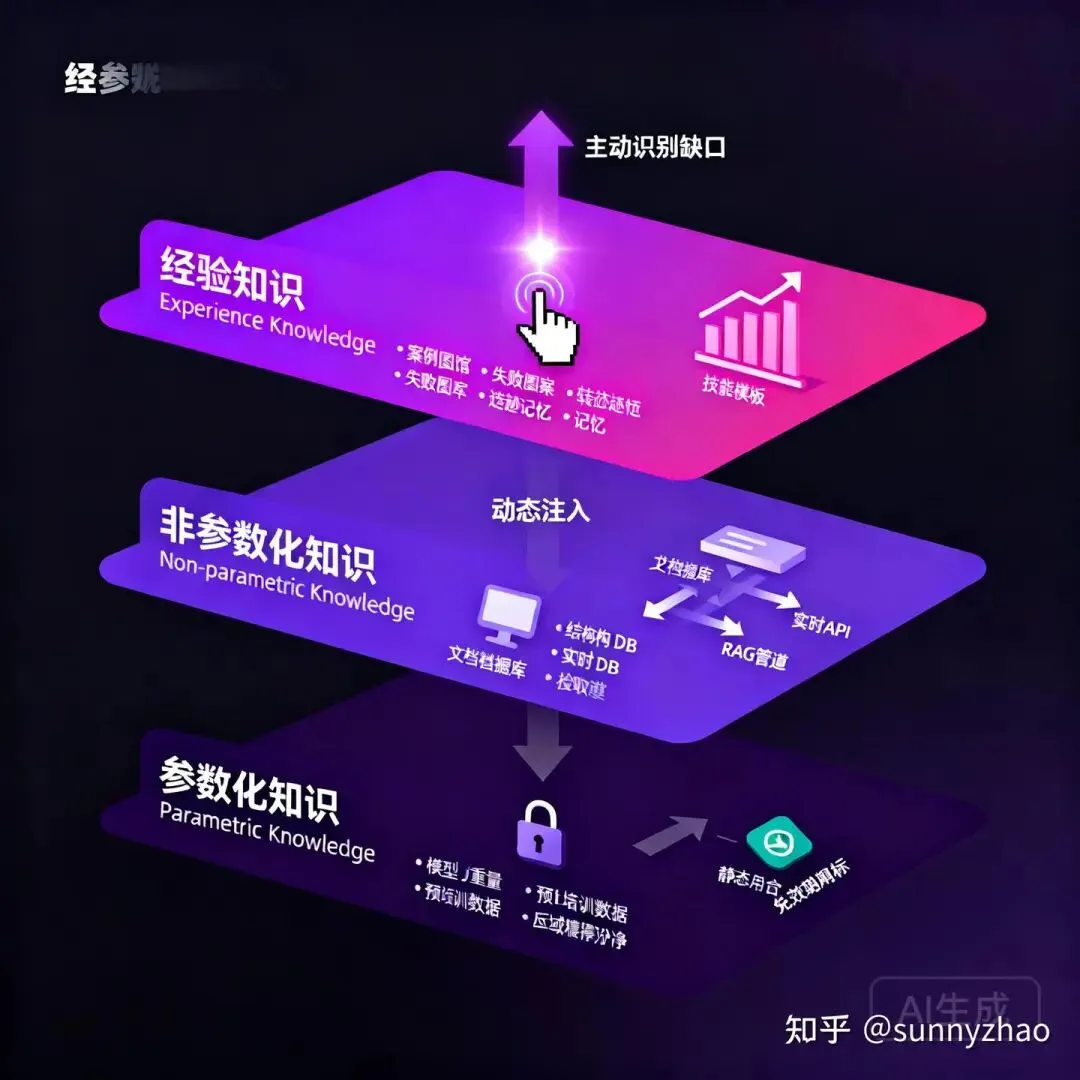 参数化知识存在于模型权重中,静态、有截止日期,更新成本极高。它构成 agent 的基础推理能力,但无法覆盖部署后发生的事情,也无法在运行时动态扩展。在对agent使用的模型进行选型时,除了本身fc等能力,还需要明确记录使用的模型的知识边界,避免对截止日期之后的内容产生不合理预期;领域专用 agent 考虑微调以强化特定领域的参数化知识密度。