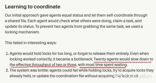 跨 agent 状态同步:维护全局任务状态,协调 agent 间的依赖关系,管理并行执行中的资源竞争,以及处理部分 agent 失败后的状态回滚或补偿策略,这是 MAS 比较复杂的工程挑战,也是大多数生产系统失败的集中地带。Cursor 2026 年 1 月的工程报告记录了一个典型案例:20 个 agent 并发协作时,锁竞争就已经把有效吞吐压到 2-3 个,agent 失败时持有的锁无法释放,系统直接挂起——最终不得不放弃全局状态同步,改用层级隔离结构绕开这个问题。