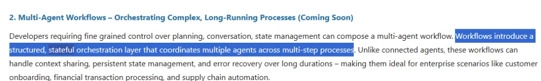 Stateful Workflow / 控制层负责:阶段转换、重试策略、补偿操作、人工审批节点、长任务的状态持久化与恢复。这里的「Workflow」不是指编排任务的工作流,而是指一种确定性的状态控制结构—执行路径在设计时固定触发特定的状态流程。它定义的是「这个任务在整个生命周期里应该经过哪些阶段」,而不是「哪个 agent 来做」。Azure AI Foundry 把 Connected Agents(agent 协作与委托)与 Multi-Agent Workflows(状态持久化、重试、错误恢复)设计为两个独立能力层,背后逻辑正是如此,前者处理概率性的 agent 推理,后者处理需要确定性保障的过程控制。