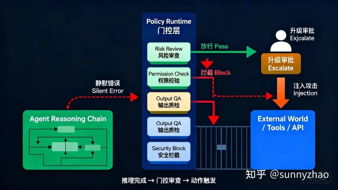 两类风险的共同点是:它们都发生在 agent 的行动边界,发生在推理过程完成之后、动作真实触发之前的那个间隙。这个间隙只有外置的门控层能覆盖。