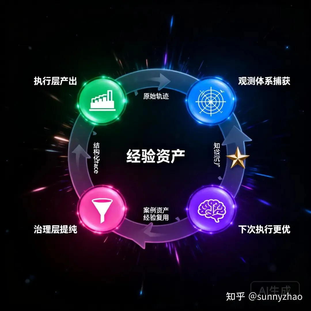 经验沉淀通道连接四层,驱动闭环持续旋转。完整流向: