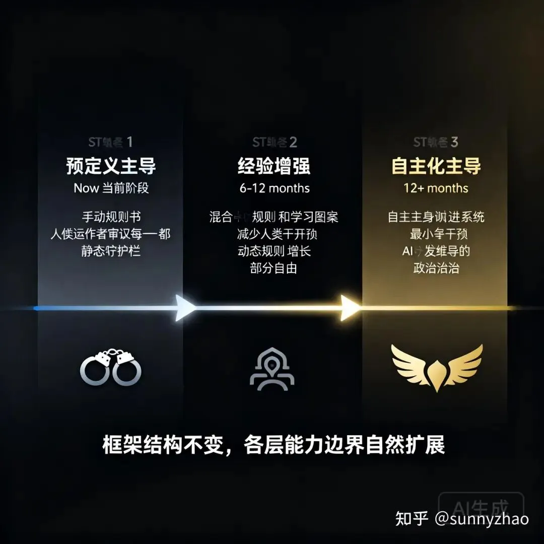这时候 Orchestrator 的任务分解可以开始引用历史成功路径,不再每次从零推理;门控层从治理层接收自动归纳的协调安全规则,动态规则开始替代部分静态规则;评估从人工主导转向自动为主、人工兜底。这一阶段最重要的感知指标是:运营成本在下降,同时任务完成质量在上升。如果两者没有同向移动,说明「经验」还没有真正进入系统的决策路径。