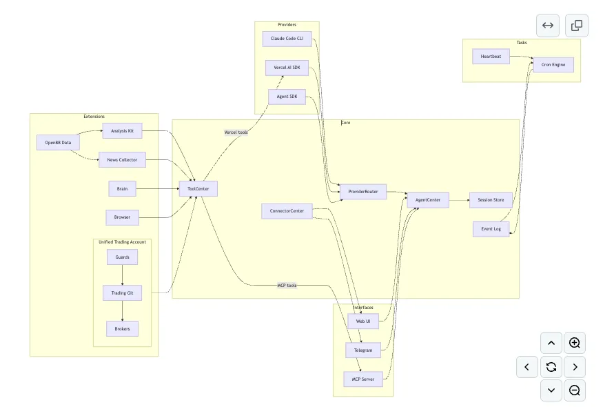 所以我看到 Open Alice 这个开源项目时,第一反应还挺直接:这东西不是单纯再塞一个 AI 聊天框进交易场景,它更像是想把“研究员、量化员、交易员、风控”这几摊活,先在本地给你拼起来。项目本身支持在 Claude Code、Vercel AI SDK、Agent SDK 这些后端之间切换,还把交易账户、风控检查、市场数据、新闻采集、任务调度和交互界面都接到了一起。