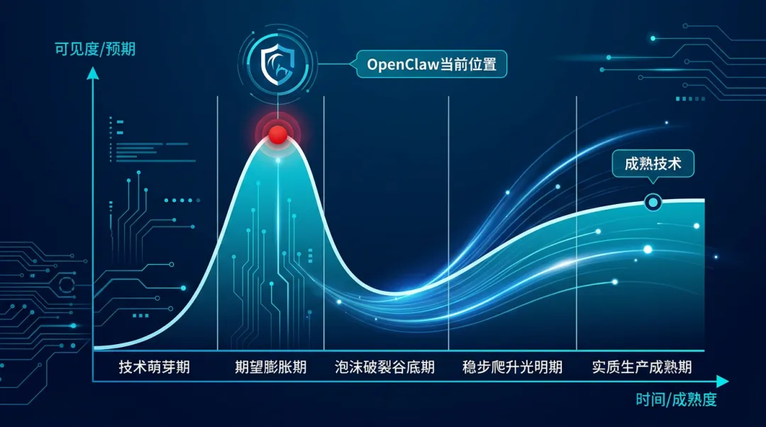 用Gartner技术成熟度曲线来说,OpenClaw现在正处于"期望膨胀期"的顶峰,也就是泡沫最大、体验最烂、风险最高的阶段。离真正稳定可用的成熟形态,大概还有一到两年。