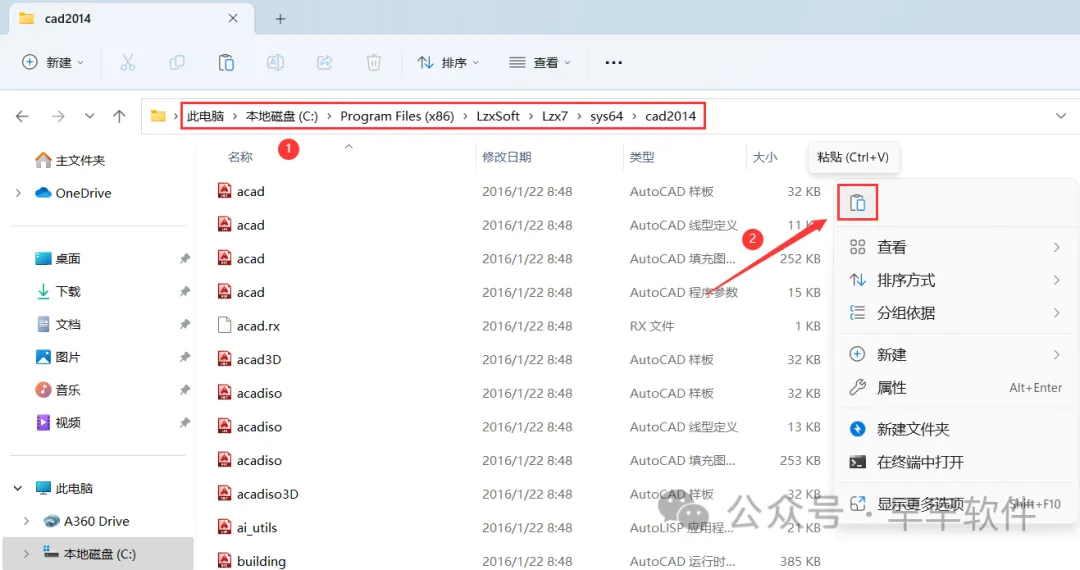 13、打开路径:C:\Program Files (x86)\LzxSoft\Lzx7\sys64\cad2014,右键文件夹的空白处,点击【粘贴按钮】