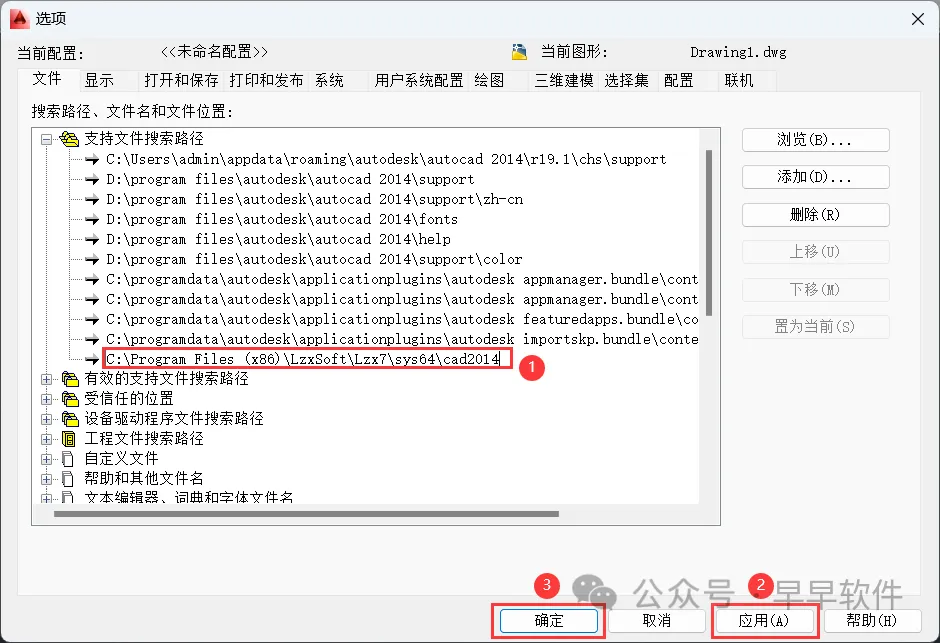19、路径输入:C:\Program Files (x86)\LzxSoft\Lzx7\sys64\cad2014(第6步查看软件安装路径),点击【应用】,再点击【确定】