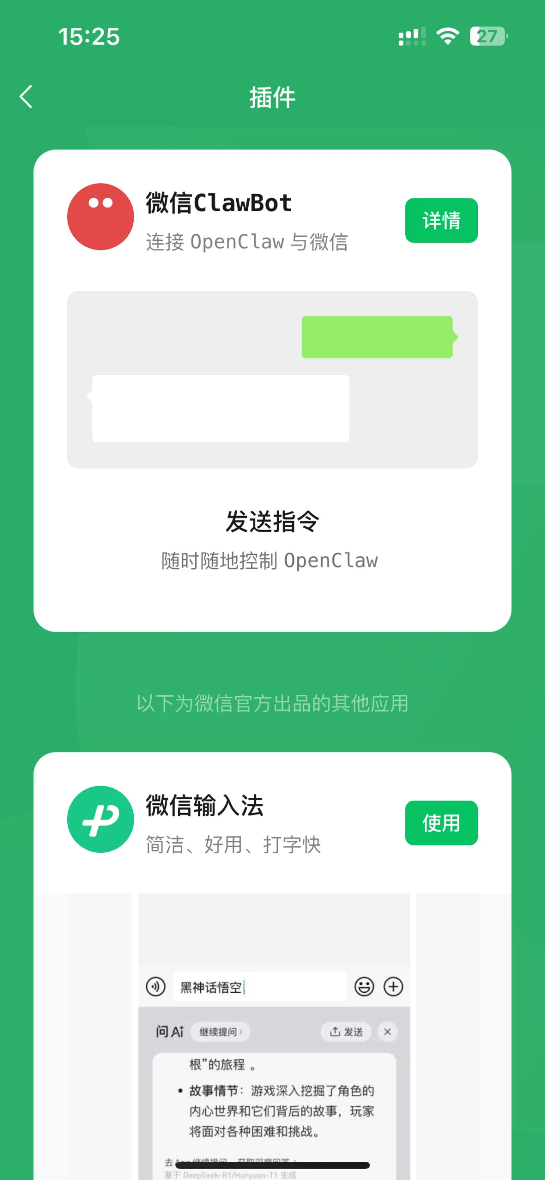 设备限制:目前只能在手机端看到ClawBot,电脑版微信还不支持。