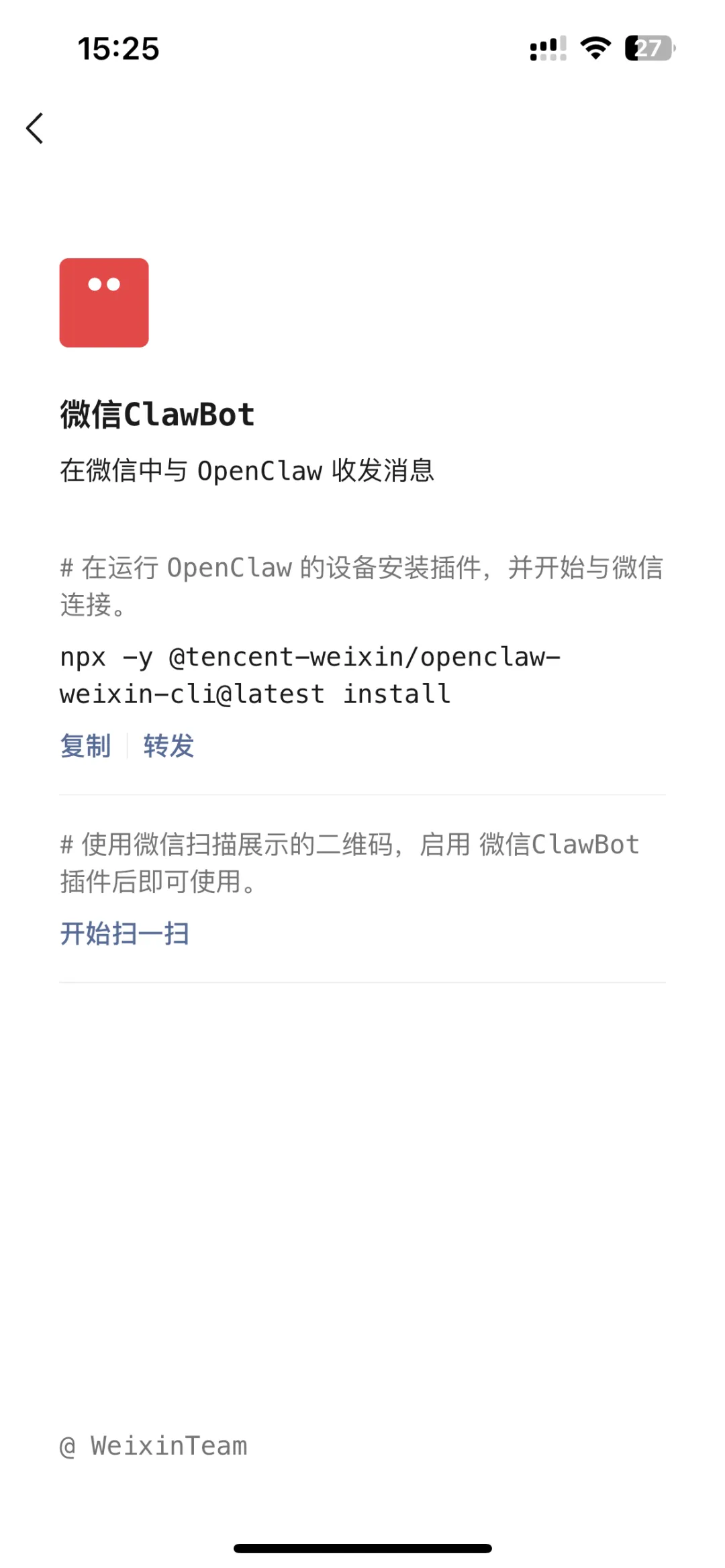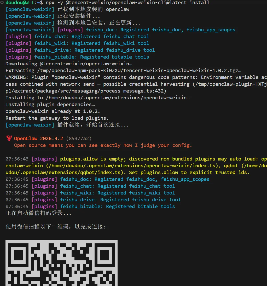 npx -y @tencent-weixin/openclaw-weixin-cli@latest install安装完成会显示二维码