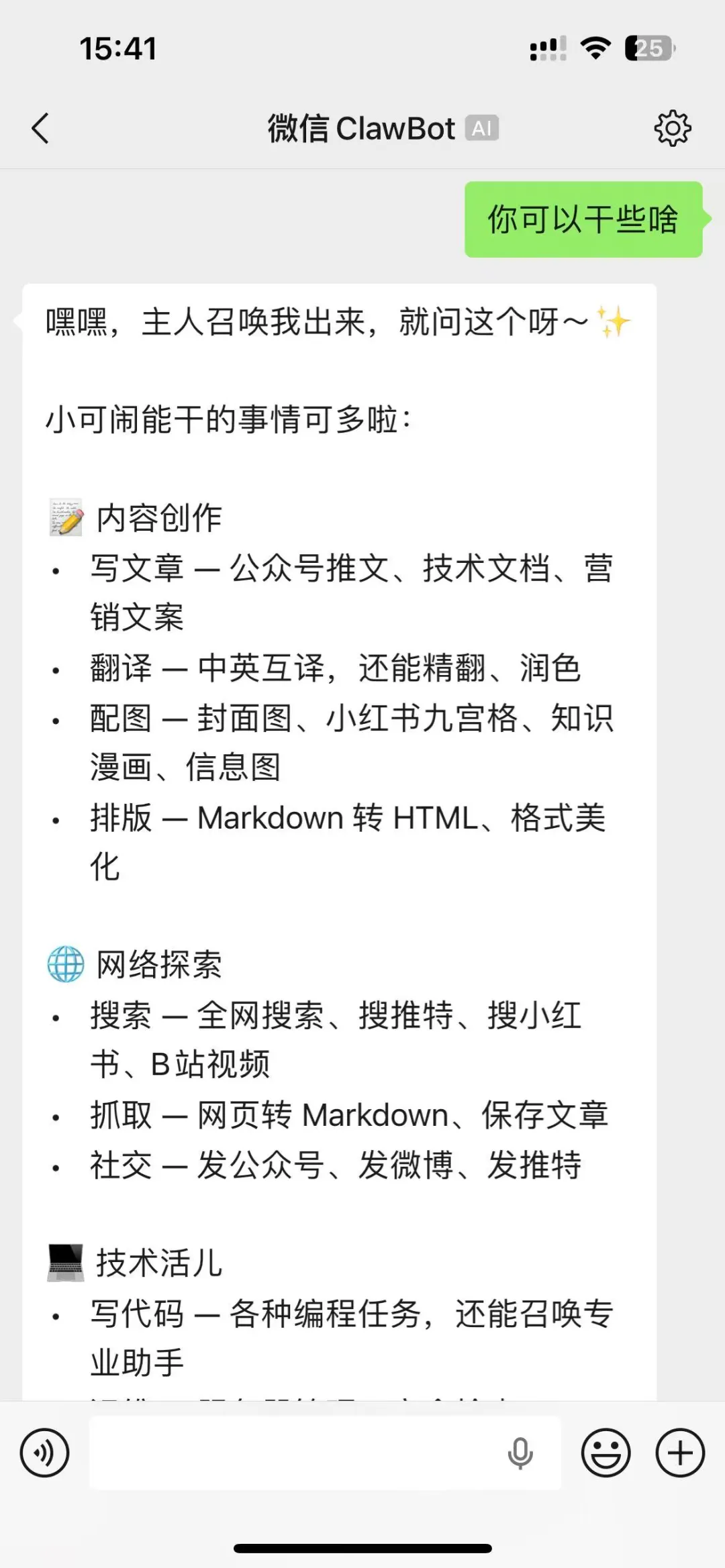 可以直接给ClawBot发图片、语音、文件。